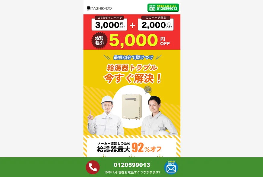万が一、給湯器が入荷待ちの状態でも、代替品の設置により当日からお湯が使えるようになります。WEB、電話いずれの申し込みにも適用される5,000円割引クーポンコードを使用するのがお得です。